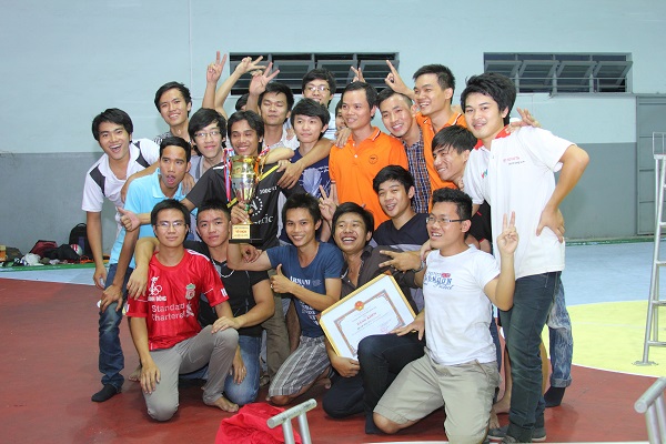 ThS. Lâm Thành Hiển (góc phải) và TS. Nguyễn Vũ Quỳnh (góc trái) hòa cùng niềm vui với đội thắng cuộc