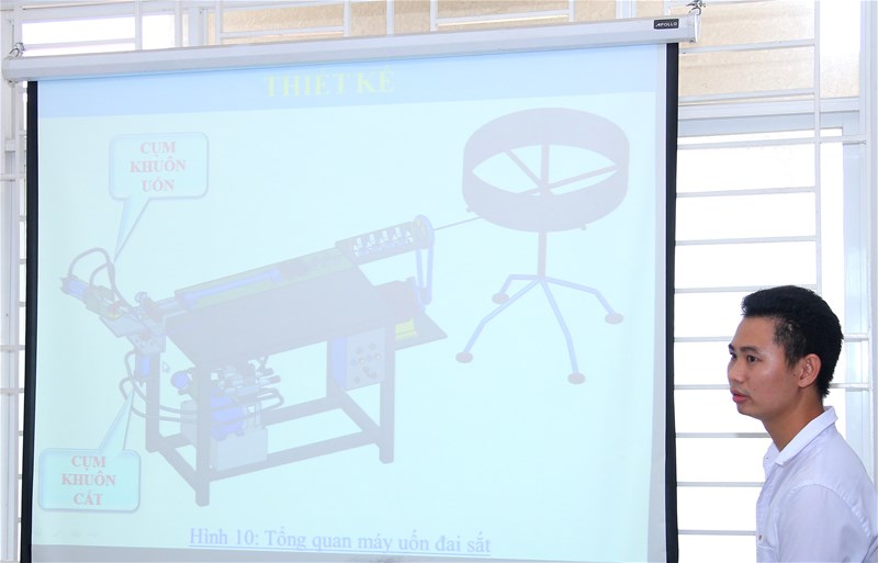 Hình 4. Sinh viên Trần Đức Diện đang báo cáo đề tài "Nghiên cứu, thiết kế và chế tạo máy cơ khí".