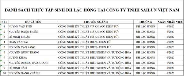 Danh sách trúng tuyển thực tập tại  Công ty TNHH Sailun Việt nam.
