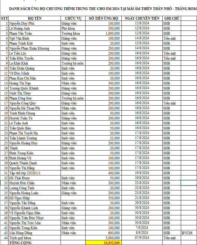 Ban tổ chức chương trình xin gửi lời cảm ơn đến quý Thầy Cô và các bạn Sinh viên đã cùng chung tay ủng hộ cho chương trình. Kính chúc quý thầy cô, các bạn sinh viên và các em tại mái ấm có một mùa trung thu thật ý nghĩa và hạnh phúc./.