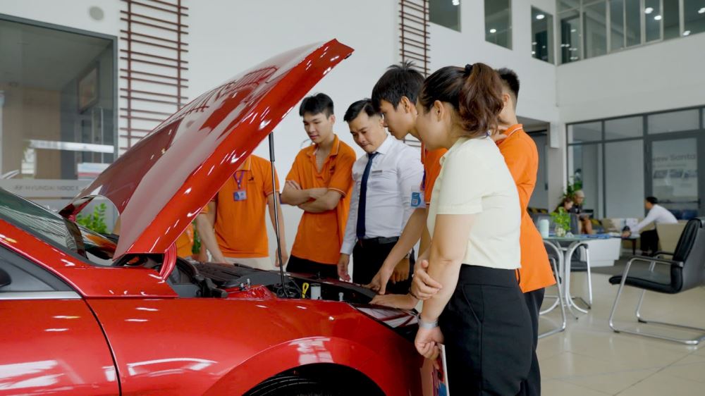 Bên cạnh việc học tập về quy trình bảo dưỡng, sinh viên còn được trải nghiệm thực tế về kỹ năng bán hàng trong ngành ô tô. Tại các phòng trưng bày của đại lý, sinh viên đã được tham gia vào quy trình bán hàng từ khâu tư vấn sản phẩm, giải thích các tính năng nổi bật của xe, đến việc đưa ra các giải pháp tài chính phù hợp với khách hàng. Đây là những kỹ năng cần thiết để sinh viên có thể tư vấn, thuyết phục và xây dựng mối quan hệ lâu dài với khách hàng.