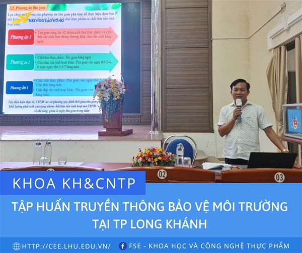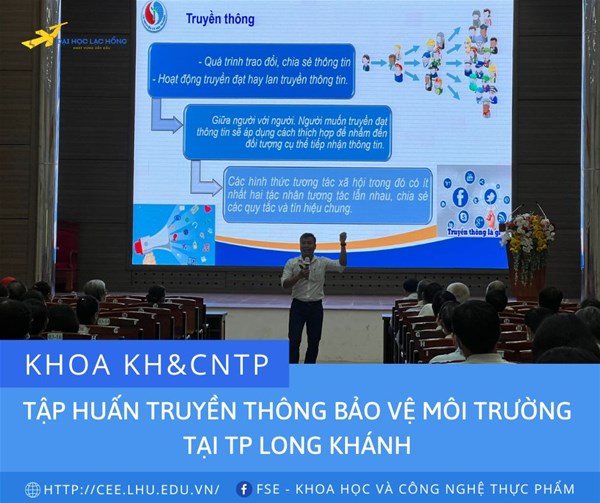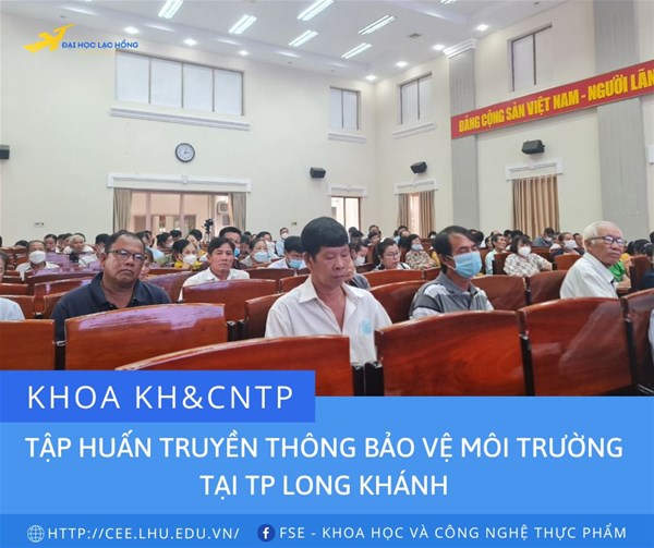 Ngày 26/8/2022, Khoa KH&CNTP đã tham gia chia sẻ chuyên đề Kỹ năng truyền thông bảo vệ môi trường tại Hội trường UBND TP Long Khánh cho hơn 300 cán bộ tuyên truyền viên tại 15 phường, xã, đại diện các Hội, Đoàn thể, Thành đoàn, Liên đoàn lao động, Hội Nông dân, Hội Cựu chiến binh, Hội Liên hiệp Phụ nữ, Hội Chữ thập đỏ, Hội Nạn nhân chất độc da cam/Dioxin, Hội Người cao tuổi và các Hợp tác xã, Tổ hợp tác vệ sinh môi trường, Hợp tác xã Dịch vụ nông nghiệp trên địa bàn TP Long Khánh.