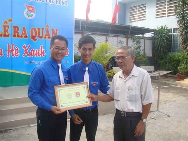 Hình 4: Đ/c Lê Sơn Quang - Bí thư Đoàn trường (ngoài cùng bên trái) trao cờ lệnh cho đội Mùa hè xanh năm 2013