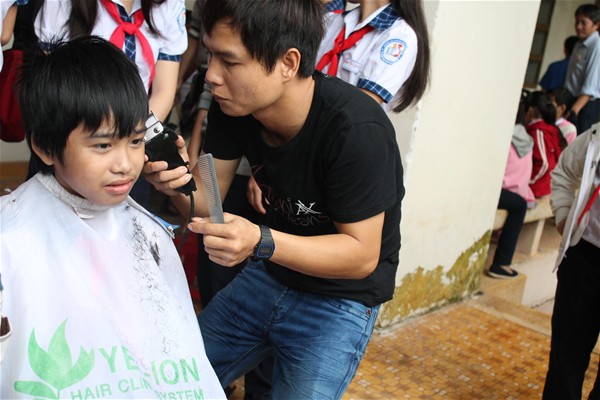 Hình 4: Ngoài chơi trò chơi, khám bệnh các em còn được các anh chị là thợ chuyên nghiệp cắt tóc.
