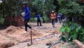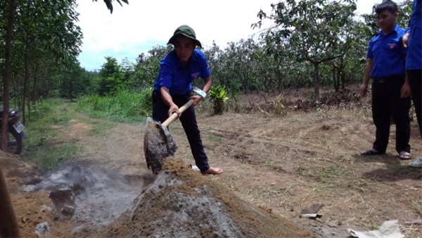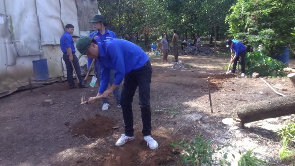 Hình 1: ông Chuyến (áo bộ đội) đang cùng sinh viên tình nguyện khai móng ngôi nhà mới