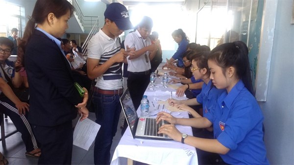 Hình 2- Bộ phận tiếp nhận đăng ký và hướng dẫn (Sinh viên Nguyễn Mạnh Cường - Khoa Kỹ thuật công trình thứ nhất bên trái qua)