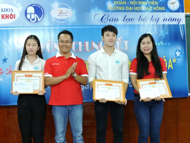 Hình 3- Đ/c Trần Tiến - Phó Bí thư; Chủ tịch HSV trao giải nhất cho sinh viên Phạm Thị Mai Phương