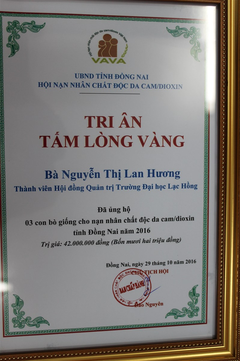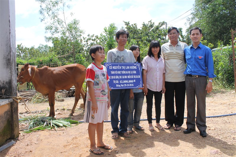 Ngày 29/10/2016 Cô Nguyễn Thị Lan Hương - Thành viên Hội đồng Quản trị nhà trường tặng 3 con bò giống (trị giá 42 triệu đồng) cho 3 gia đình nhiễm chất độc da cam có hoàn cảnh đặc biệt khó khăn và có khả năng nuôi bò tại huyện Cẩm Mỹ và huyện Định Quán.