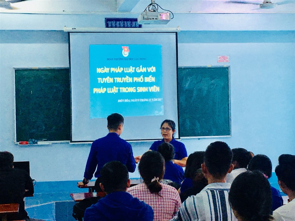 Căn cứ Kế hoạch 20-KH/TĐTN-BTG ngày 27/09/2017 của Ban Thường vụ Tỉnh đoàn về Kế hoạch phổ biến, giáo dục pháp luật năm 2018. Ngày 05 tháng 10 năm 2018, tại Cơ sở 3 – trường Đại học Lạc Hồng, Ban Thường vụ Đoàn trường - Ban Thư ký Hội Sinh viên trường đã phối hợp với Ban Tuyên giáo tỉnh Đồng Nai tổ chức lớp tập huấn phổ biến, giáo dục pháp luật nhân ngày Pháp Luật & Học tập và làm theo tấm gương đạo đức Hồ Chí Minh gắn với rèn luyện tác phong của Cán bộ Đoàn sáng tạo, gương mẫu... năm 2018.