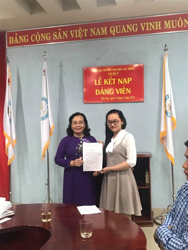 Được sự thống nhất của Ban thường vụ Đảng ủy Khối, Đảng ủy trường Đại học Lạc Hồng, vào lúc 7h30 ngày 07 tháng 11 năm 2019 tại phòng họp cơ sở 1 trường Đại học Lạc Hồng, Chi bộ 4 đã tiến hành tổ chức lễ kết nạp Đảng viên cho quần chúng xuất sắc Nguyễn Ngọc Minh Chi vào Đảng Cộng sản Việt Nam; Đến dự buổi lễ kết nạp có Đ/c Nguyễn Thị Thu Lan – Phó Bí thư Đảng ủy nhà trường – Bí thư chi bộ 4, cùng toàn thể Đảng viên trong Chi bộ.
