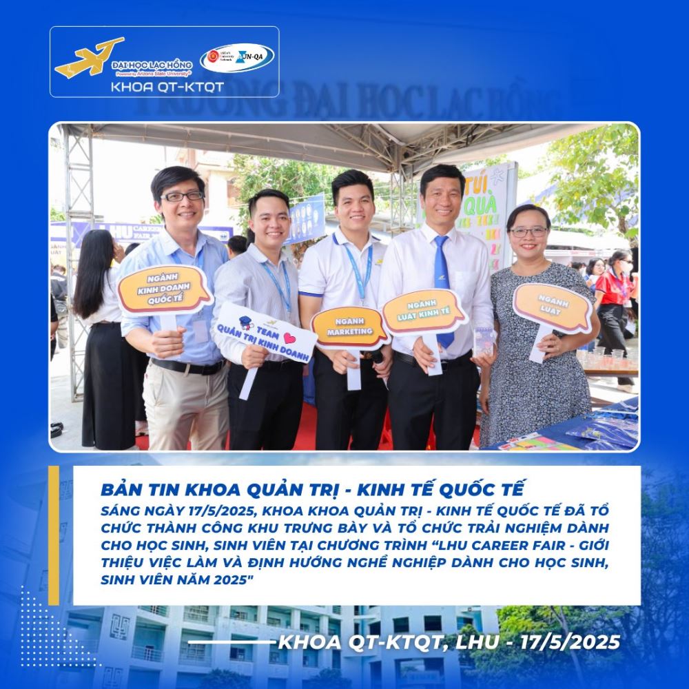 Trong khuôn khổ chương trình “LHU Career Fair 2025 – Ngày hội việc làm và định hướng nghề nghiệp dành cho học sinh, sinh viên”, gian hàng của Khoa Quản trị – Kinh tế quốc tế, Trường Đại học Lạc Hồng phối hợp cùng Đoàn – Hội Sinh viên Trường đã trở thành điểm đến nổi bật, thu hút đông đảo học sinh THPT và sinh viên đến tham quan, giao lưu và tìm hiểu cơ hội nghề nghiệp.