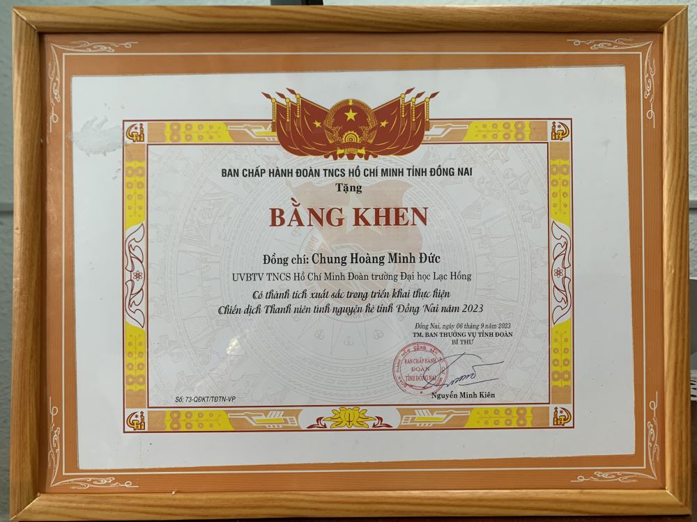 Hình 4: Bằng Khen Chung Hoàng Minh Đức - UV.BTV Đoàn trường, Đội trưởng Đội Mùa hè xanh năm 2023