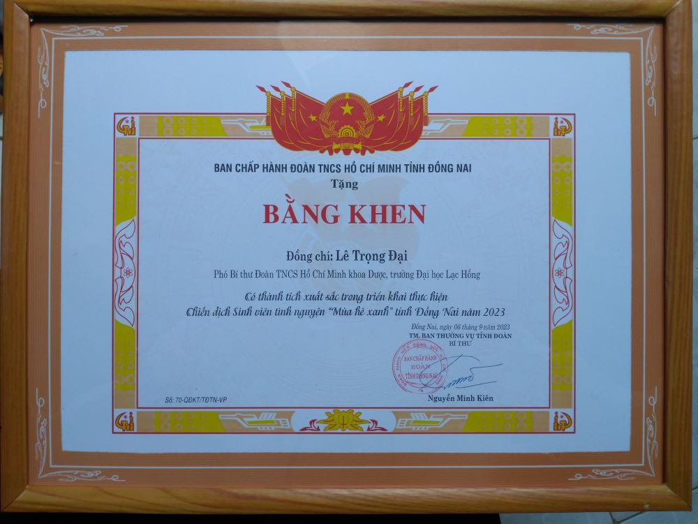 Hình 6: Bằng khen Đ/c Lê Trọng Đại - Phó Bí thư Đoàn khoa Dược, Đội phó Đội Mùa hè xanh 2023