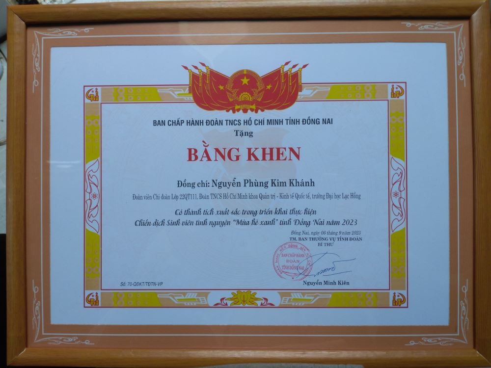 Hình 3: Bằng Khen Đ/c Trương Lê Bảo Trinh - Bí thư Đoàn trường Đại học Lạc Hồng