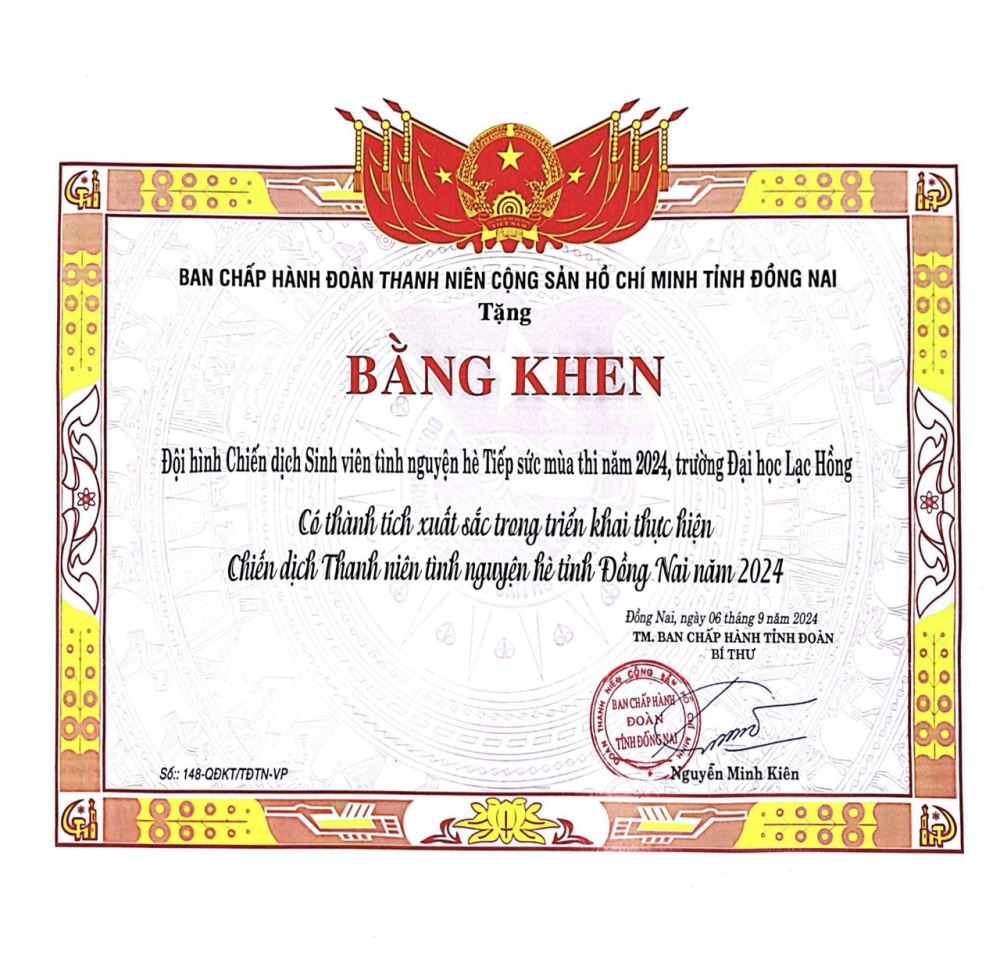 Ban Thường vụ Đoàn trường xuất sắc với Bằng khen của Tỉnh đoàn có thành tích xuất sắc trong Chiến dịch Tiếp sức mùa thi và Chiến dịch Mùa hè xanh năm 2024.