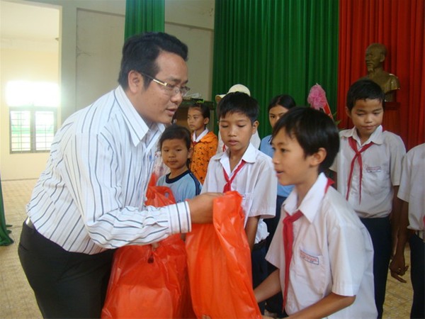 Đ/c Trương Hải Thi tặng tập vở cho các em học sinh