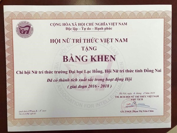 Ngày 16/5/2019 vừa qua, tại Hội nghị Biểu dương Nữ trí thức tiêu biểu lần thứ 2 (2016-2018) diễn ra tại Hà Nội, tập thể Chi Hội Nữ trí thức Lạc Hồng đã vinh dự được Hội Nữ trí thức Việt Nam trao tặng Bằng khen có thành tích xuất sắc trong hoạt động Hội giai đoạn 2016-2018.