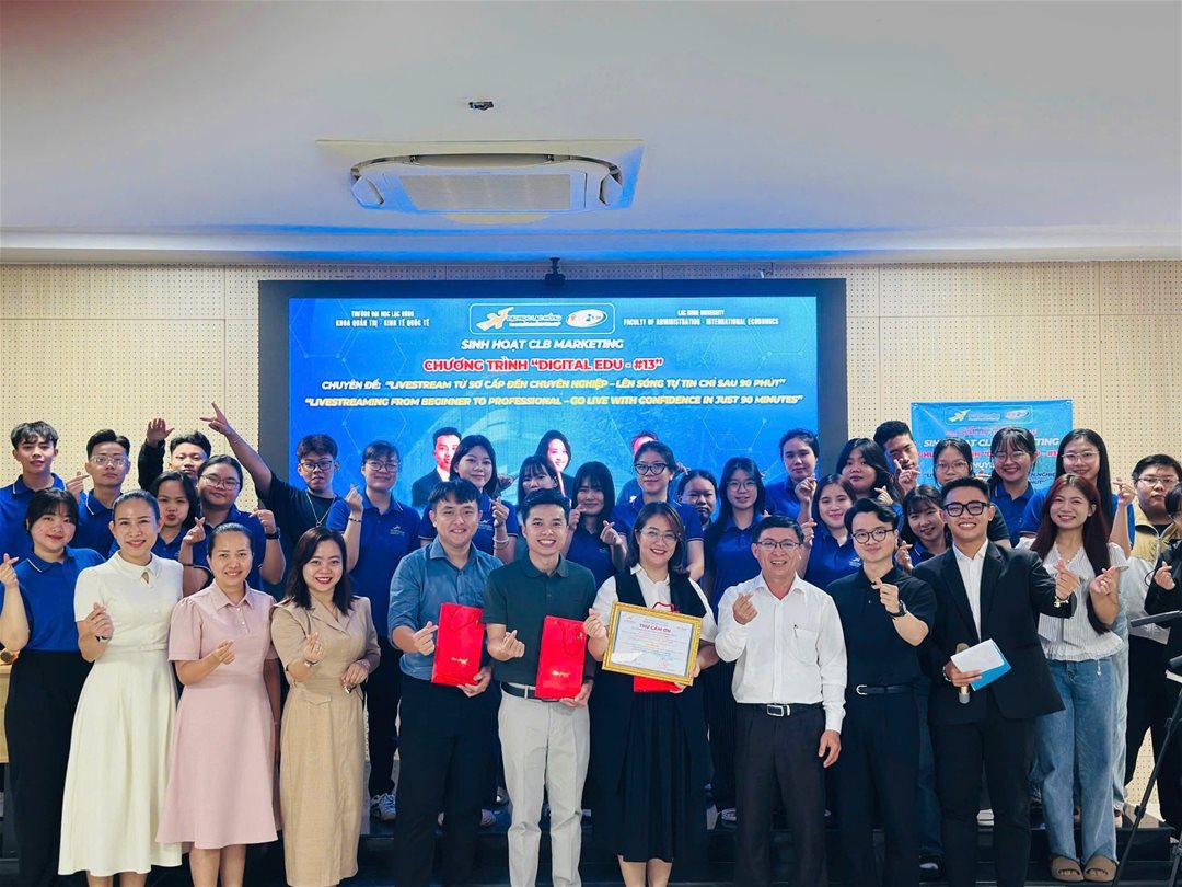 Sáng ngày 11/12/2025, tại Phòng B203 – Cơ sở 1 – Trường Đại học Lạc Hồng, Câu lạc bộ Marketing – Khoa Quản trị – Kinh tế quốc tế đã tổ chức buổi sinh hoạt chuyên đề với chủ đề “Livestream từ sơ cấp đến chuyên nghiệp – Lên sóng tự tin chỉ sau 90 phút”. Chương trình thu hút sự tham gia đông đảo của sinh viên yêu thích lĩnh vực Marketing, truyền thông và sáng tạo nội dung số.