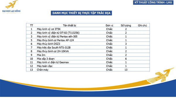 Trong những năm gần đây, để đáp ứng nhu cầu đào tạo và hiện đại hóa các trang thiết bị cho phù hợp với thực tế sản xuất, Phòng Thực tập Trắc địa được nhà trường trang bị máy móc thiết bị phục vụ học tập bao gồm: máy kinh vĩ quang học, máy thủy bình, máy toàn đạc điện tử và các dụng cụ đi kèm như chân ba, mia, thước thép, thước dây, sào tiêu...