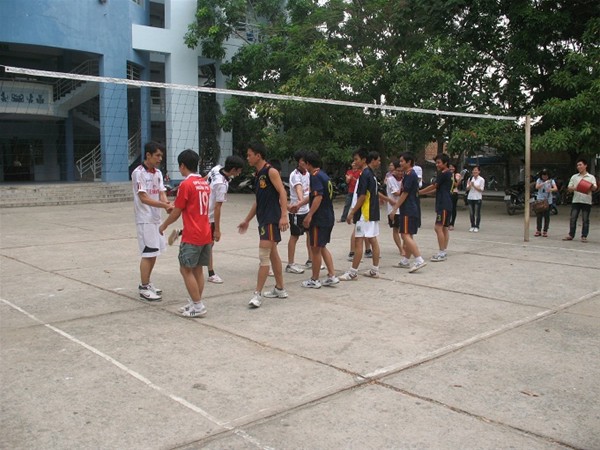 Hình 5: Hai đội 09LU111 (áo đỏ) và 09QT2+3 (áo trắng) bắt tay trước khi thi đấu