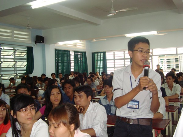 Hình 2: Thầy ThS. Lưu Ngọc Liêm trao đổi, giải đáp thắc mắc của sinh viên nghiên cứu tại buổi Hội thảo