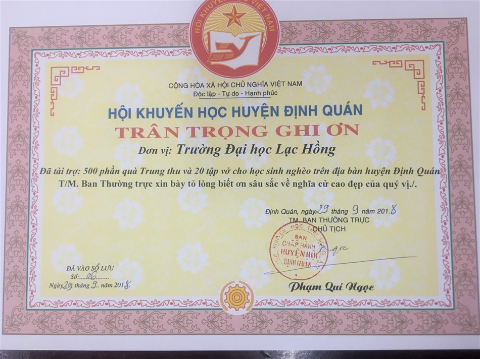 Tiếp theo chuỗi chương trình đó là sáng ngày 22 tháng 9 năm 2018, đã trao 500 phần quà, 400 tập vở và quà cho các bạn học sinh khó khăn tại trường tiểu học Đinh Tiên Hoàng thuộc huyện Định Quán tỉnh Đồng Nai. Ông Phạm Thế Chương - Chủ tịch Hội khuyến học huyện Định Quán cũng đã gửi lời cảm ơn, chúc sức khỏe tới trường Đại học Lạc Hồng và mong nhận được sự chung tay của trường trong thời gian tới.