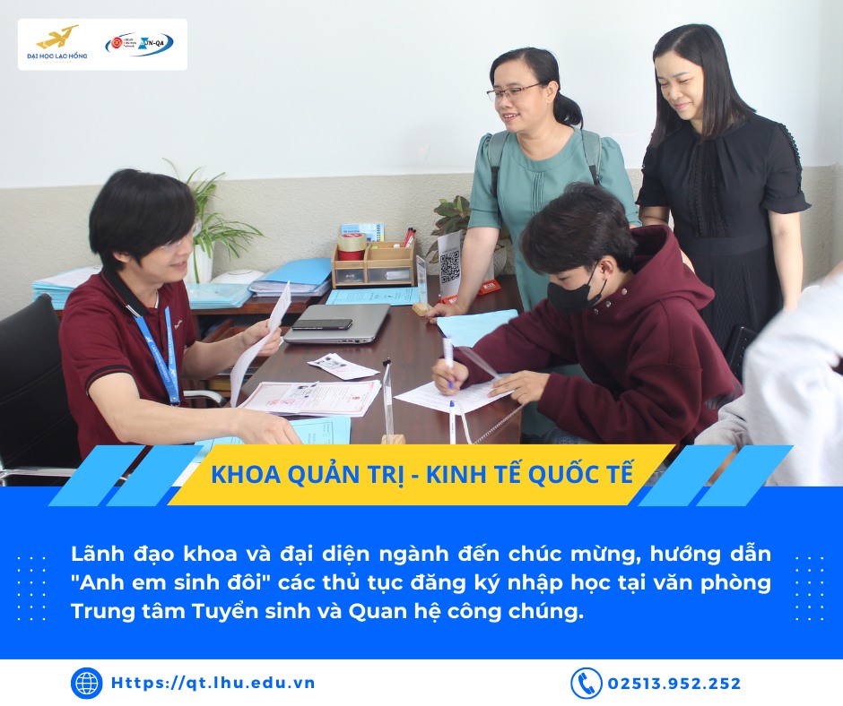 Ban lãnh đạo Khoa Quản trị - Kinh tế quốc tế hay tin đã gửi lời chúc mừng đến hai anh em sinh đôi và trực tiếp chào đón hai em, hướng dẫn các thủ tục đăng ký nhập học, hy vọng rằng hai em sẽ có một thời gian học tập thú vị và bổ ích tại khoa Quản trị - Kinh tế quốc tế.