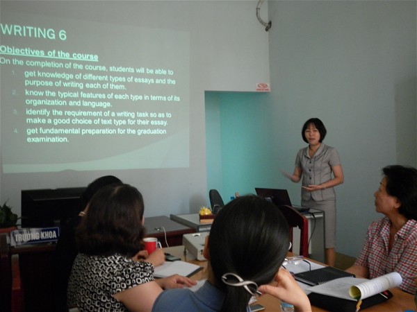 Được sự chỉ đạo của Ban giám hiệu nhà trường về việc biên soạn và thẩm định bài giảng chất lượng cao, vào lúc 14 giờ ngày 28 tháng 10 năm 2011, tại phòng E304, Khoa Ngoại Ngữ tiếp tục tổ chức buổi thẩm định bài giảng đối với hai môn: Writing 6 văn bằng 1 do cô Lê Thị Bích Vy biên soạn và Speaking 1 văn bằng 2 do cô Phạm Thị Nghĩa biên soạn.