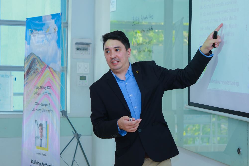 Chiều 19/5/2023, Khoa Ngôn ngữ Anh đã phối hợp cùng Nhà xuất bản National Geographic Learning (NGL) tổ chức buổi Hội thảo “Hướng dẫn sử dụng bộ giáo trình Voices và các công cụ số hỗ trợ giảng viên thiết kế và xây dựng bài giảng các học phần tiếng Anh căn bản” tại trường Đại học Lạc Hồng. Tham gia buổi Hội thảo có ban lãnh đạo khoa và các giảng viên cơ hữu khoa Ngôn ngữ Anh. Về phía NGL có sự tham gia của Bà Nguyễn Phạm Mai Trâm - Cố vấn cấp cao của NGL, và Ông Andrew Duenas - Diễn giả- Chuyên gia đào tạo học thuật .