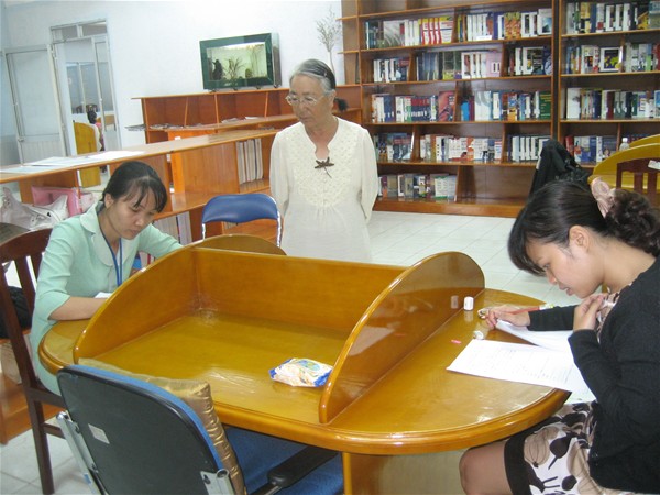 Làm bài kiểm tra dưới sự giám sát của GS.TS Kazue Tazaki (Người mặc áo trắng)