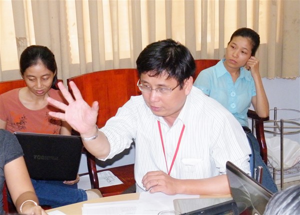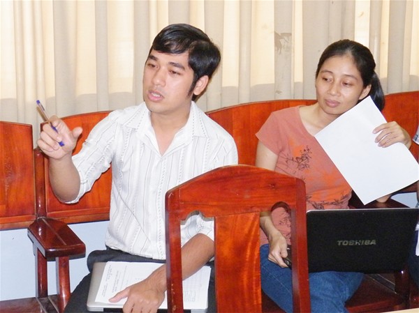 ThS. Lâm Thành Hiển trao đổi, góp  ý cho thầy Tạ Nguyễn.