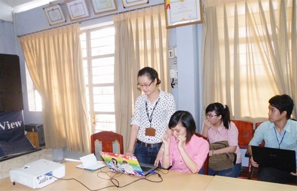 Trần Thị Thu Thảo và Vũ Thị Chinh báo cáo tiến độ đề tài “Xây dựng hệ thống phân loại tài liệu tiếng Việt”.