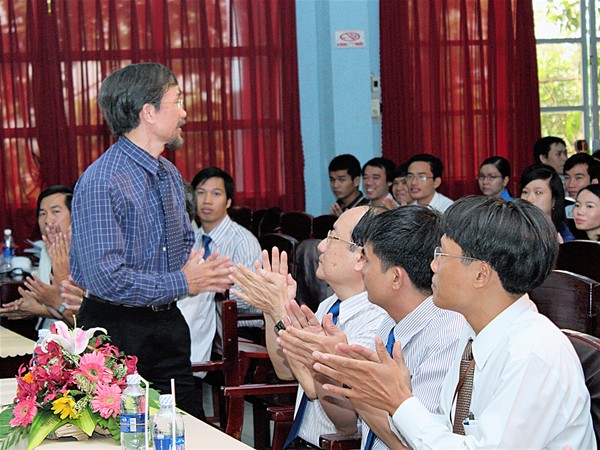 PGS.TS. Trần Văn Lăng - Trưởng Khoa CNTT- trao những bông hoa tươi thắm cảm ơn đến TS. Diệp Cẩm Thu và Ban giám hiệu Nhà trường.