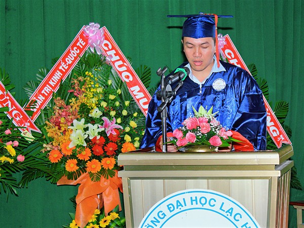 Bạn Nguyễn Quốc Tuân đại diện tất cả các tân kỹ sư phát biểu cảm nghĩ về những năm tháng học tập và rèn luyện tại Khoa CNTT dưới mái trường Đại học Lạc Hồng thân yêu.