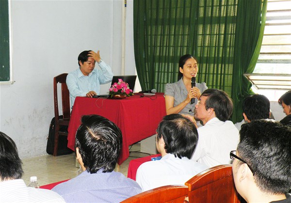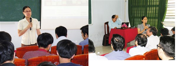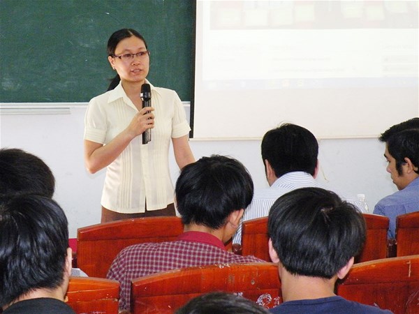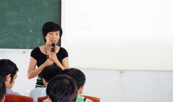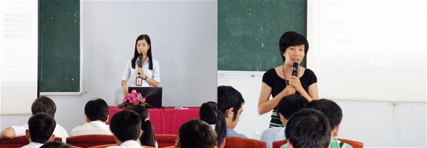 Cô Văn Đình Vỹ Phương (hình trái), Thư ký Khoa CNTT giới thiệu với các tân sinh viên về các thủ tục và các mẫu văn bản, các qui định chung của Trường. Cô Lâm Thị Hòa Bình (hình phải), Giáo vụ Cao học giới thiệu đến sinh viên các bậc cao hơn sau khi các bạn tốt nghiệp đại học.