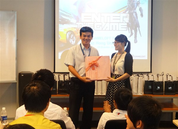 Thầy Phạm Công Xuyên (bên trái), Phó Khoa CNTT, Trường Đại học Lạc Hồng gửi lời cảm ơn và tặng quà lưu niệm đến Công ty GameLoft.