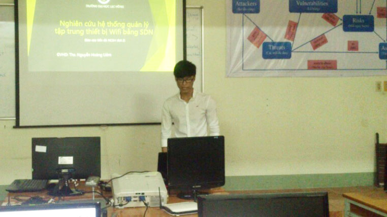 Sinh viên Lê Ngọc Quí báo cáo tiến độ đề tài Nghiên cứu hệ thống quản lý tập trung thiết bị wifi bằng SDN.