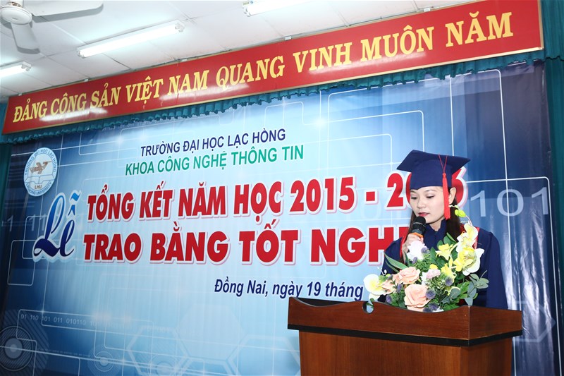 Tân kỹ sư Nguyễn Thị Bảo Xuyên đại diện tất cả các tân kỹ sư phát biểu cảm nghĩ về những năm tháng học tập và rèn luyện tại Khoa CNTT, dưới mái Trường Đại học Lạc Hồng thân yêu.