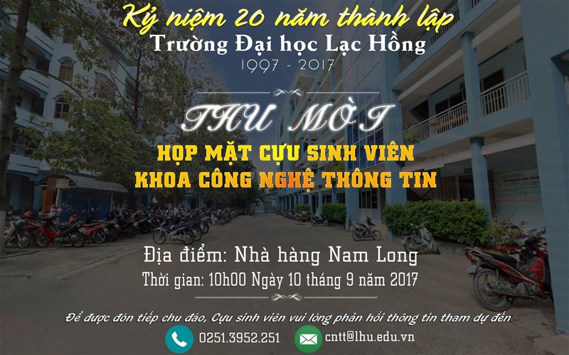 Khoa Công nghệ thông tin trân trọng kính mời các Anh/Chị cựu sinh viên đến tham dự buổi họp mặt giao lưu thân mật giữa các thế hệ sinh viên đã gắn bó học tập tại khoa Công nghệ thông tin,Trường Đại học Lạc Hồng tại: