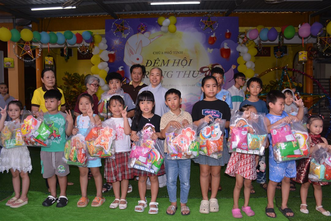 Từ buổi chiều, sân chùa rực rỡ sắc màu của đèn lồng và tiếng cười vui tươi của các em nhỏ. Các hoạt động như trò chơi dân gian, múa lân, tặng quà Trung thu, bánh kẹo, sữa và lồng đèn được tổ chức chu đáo, mang đến niềm vui và tiếng cười cho các em.