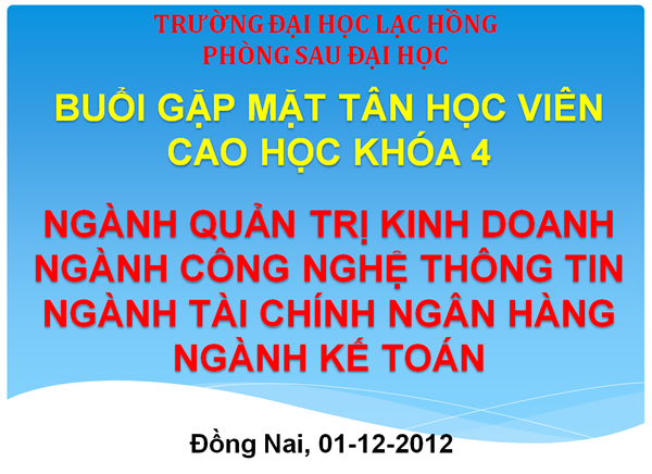 Buổi chiều ngày 01/12/2012, Phòng Sau đại học Trường Đại học Lạc Hồng có tổ chức buổi gặp mặt tân học viên cao học khóa 4 tại phòng G301.