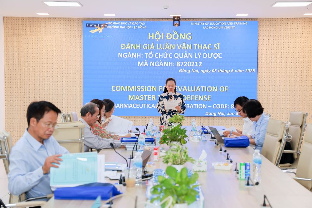 Ngày 08 tháng 6 năm 2025, tại phòng họp cơ sở 1 của Trường Đại học Lạc Hồng (LHU), 10 học viên thuộc ngành Tổ chức quản lý dược đã hoàn thành phần trình bày và bảo vệ luận văn thạc sĩ trước hội đồng chuyên môn. Buổi bảo vệ diễn ra trong không khí trang nghiêm, học thuật và chuyên nghiệp, đánh dấu cột mốc quan trọng trong quá trình đào tạo sau đại học tại nhà trường.
