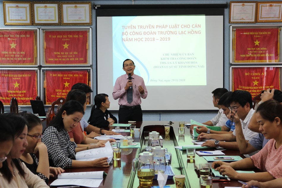 Nhằm mục đích tuyên truyền, vận động cán bộ, nhà giáo, người lao động (CBNGNLĐ) chủ động tìm hiểu chủ trương, đường lối của Đảng, chế độ, chính sách, pháp luật của Nhà nước, góp phần nâng cao ý thức pháp luật, trách nhiệm công dân, sống và làm việc theo Hiến pháp và pháp luật;  Giáo dục ý thức, lợi ích của việc tuân thủ, chấp hành pháp luật gắn với giáo dục tư tưởng chính trị, đạo đức lối sống, ý thức tuân thủ kỷ luật, nâng cao ý thức trách nhiệm của CBNGNLĐ. Trong năm 2018, căn cứ vào các văn bản hướng dẫn của CĐGDVN và kế hoạch của CĐCS về công tác phổ biến giáo dục pháp luật, CĐCS Đại học Lạc Hồng đã tổ chức 02 buổi tuyên truyền cho cán bộ công đoàn được lồng ghép trong các buổi họp BCHCĐMR vào các ngày 30/3/2018 và 29/11/2018 với các nội dung chính:  Phổ biến công tác kiểm tra công đoàn;  tuyên truyền, phổ biến các văn bản pháp luật liên quan trực tiếp đến quyền và lợi ích hợp pháp, chính đáng của người lao động như: Bộ Luật Lao động năm 2012, Luật Công đoàn 2012, Luật Bảo hiểm xã hội 2014, Luật Bảo hiểm y tế 2014; phòng chống tham nhũng, lãng phí…