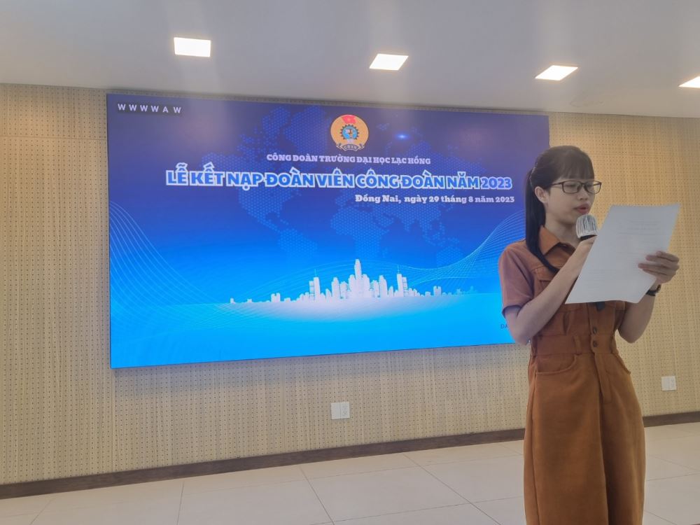 Thay mặt Ban Chấp hành Công đoàn cơ sở, đ/c Trần Thị Thiên Thanh – Phó Chủ tịch Công đoàn Trường Đại học Lạc Hồng công bố quyết định kết nạp 16 công đoàn viên mới.
