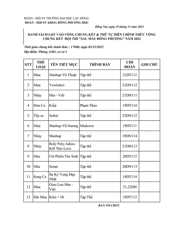Qua một buổi làm việc đầy trách nhiệm và công tâm, Ban giám khảo đã chọn ra được 13 tiết mục cùng tranh tài trong đêm chung kết sẽ diễn ra vào ngày 03/12/2022 tại A301, Cơ Sở 1 với các tiết mục đầy “sắc màu” đúng với tên gọi của hội thi “ Sắc màu Đông Phương”. Không chỉ đa dạng về tiết mục và phong cách biểu diễn mà còn hấp dẫn bởi trang phục, đạo cụ minh họa, bên cạnh đó còn có những tiết mục biểu diễn tập thể, điều này càng làm tăng thêm ý nghĩa của hội thi, thể hiện tinh thần giao lưu đoàn kết, gắn bó trong sinh viên giữa các chi đoàn thông qua hoạt động văn nghệ, âm nhạc. Tất cả những điều này hứa hẹn một đêm chung kết sôi động, hấp dẫn và đầy kịch tính.