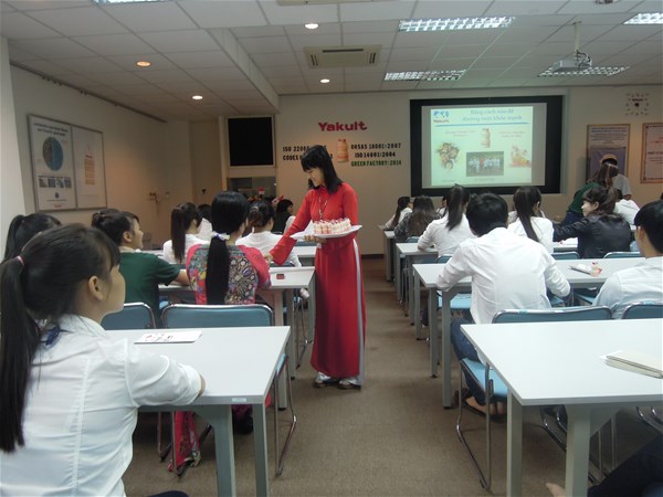 Đến nơi, được nhân viên Yakult hướng dẫn về lịch sử hình thành của công ty, tham quan nhà máy và xem những đoạn phim ngắn vui nhộn và sinh động về việc phát minh ra sữa Yakult, các tác dụng bổ ích của sữa lên men, được tham gia trả lời những câu hỏi thú vị về công ty và nhận được những phần quà hấp dẫn. Sau đó, chúng em được mời thưởng thức sản phẩm Yakult tại chỗ và được hướng dẫn phân loại rác đối với vỏ và chai nhựa sau khi sử dụng và được tặng 1 cây bút bi Yakult được tái chế từ vỏ chai yakult làm kỷ niệm.