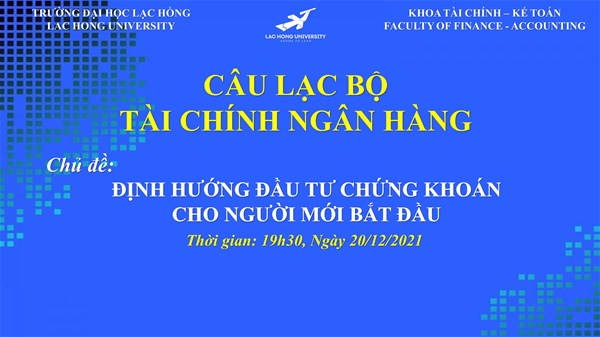 Nằm trong chuỗi sinh hoạt định kỳ hàng tháng, vào lúc 19h30 ngày 20/12/2021, CLB Tài chính – Ngân hàng tổ chức sinh hoạt với chuyên đề “Định hướng đầu tư chứng khoán cho người mới bắt đầu” với hình thức trực tuyến thông qua nền tảng Zoom.