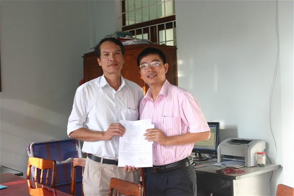 Ts. Nguyễn Văn Tân trao học bổng cho trường THPT Xuân Diệu thầy Trần Duy Thuận(người bên trái) đại diện nhận