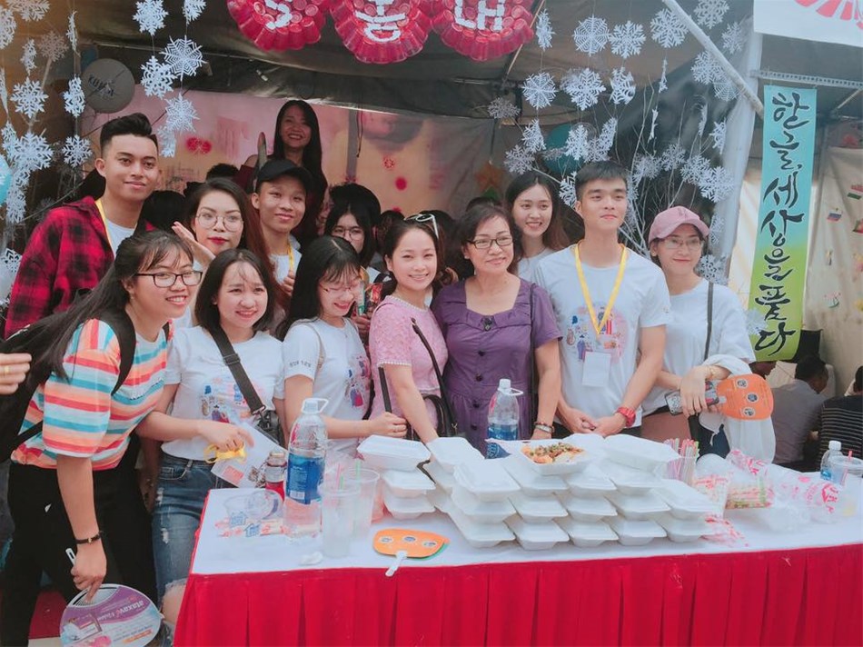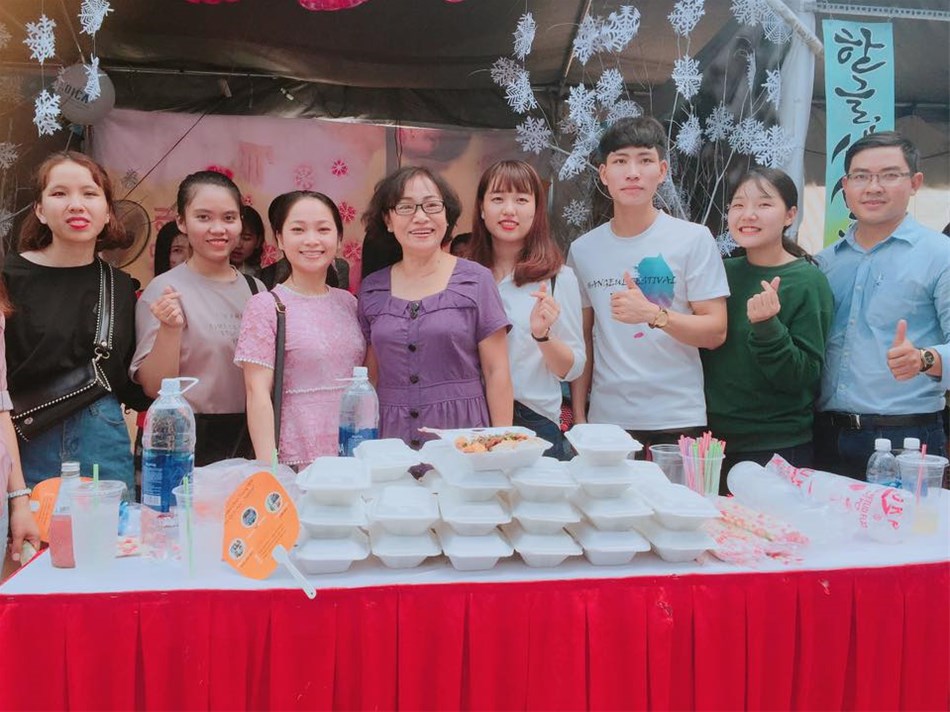 Đội hình phụ trách ẩm thực trong Lễ hội của lớp 16DH111 chụp hình với các Thầy, Cô