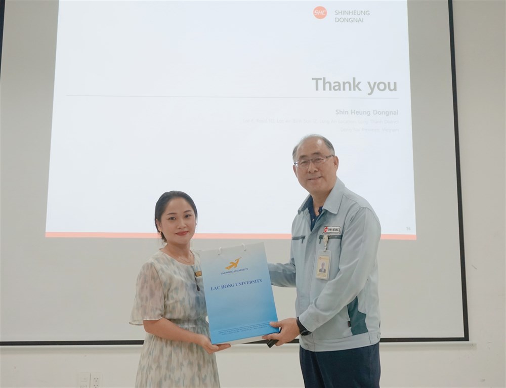 Tại buổi tham quan, Lãnh đạo Công Ty TNHH Shin Heung Đồng Nai đã có buổi nói chuyện thân mật với các bạn sinh viên ngành Hàn Quốc học. Ngoài những giới thiệu sơ lược về quá trình hình thành và phát triển của doanh nghiệp, Lãnh đạo công ty còn cho biết, hiện tại công ty đang có nhu cầu tuyển dụng rất nhiều nhân sự biết tiếng Hàn, đồng thời bày tỏ mong muốn sinh viên ngành Hàn Quốc học, Đại học Lạc Hồng nộp hồ sơ xin việc, Lãnh đạo công ty đánh giá rất cao năng lực tiếng Hàn của sinh viên Lạc Hồng.